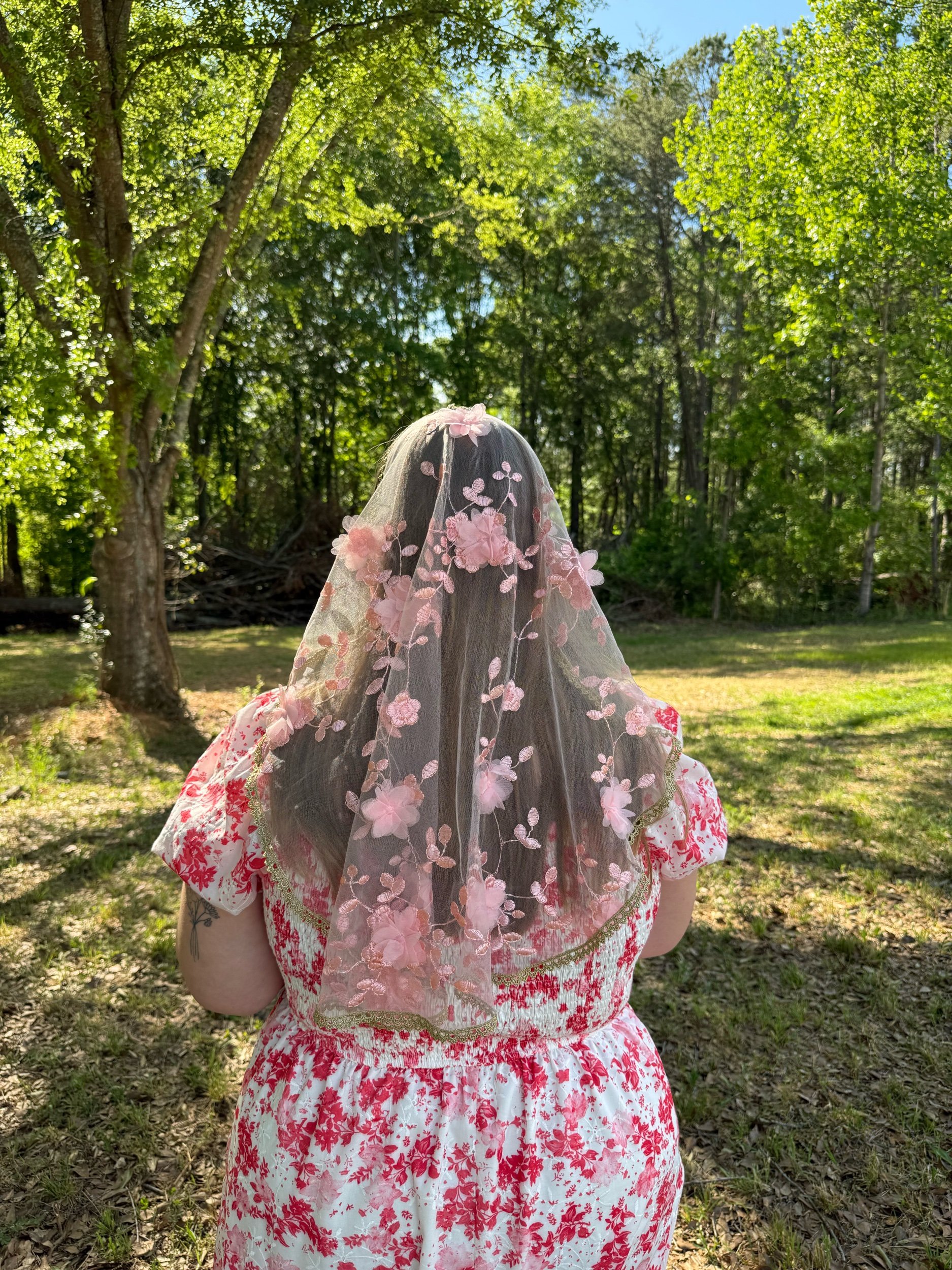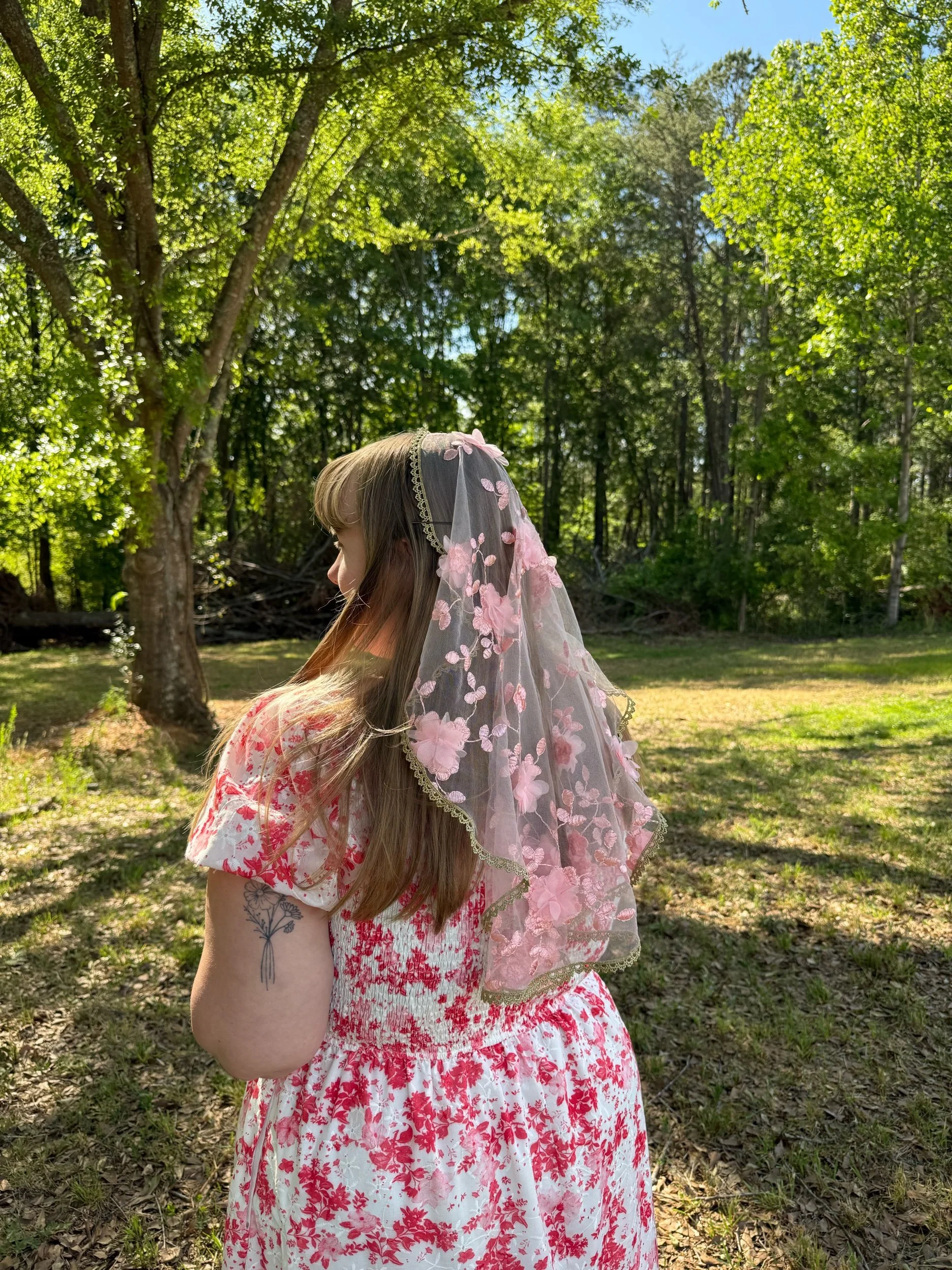 This pink and gold Blossoms of Devotion veil symbolizes a heart rooted in faith, where devotion blooms gently over time. Just as flowers open in the light, this veil reflects a soul turned toward God, growing in love, humility, and grace.